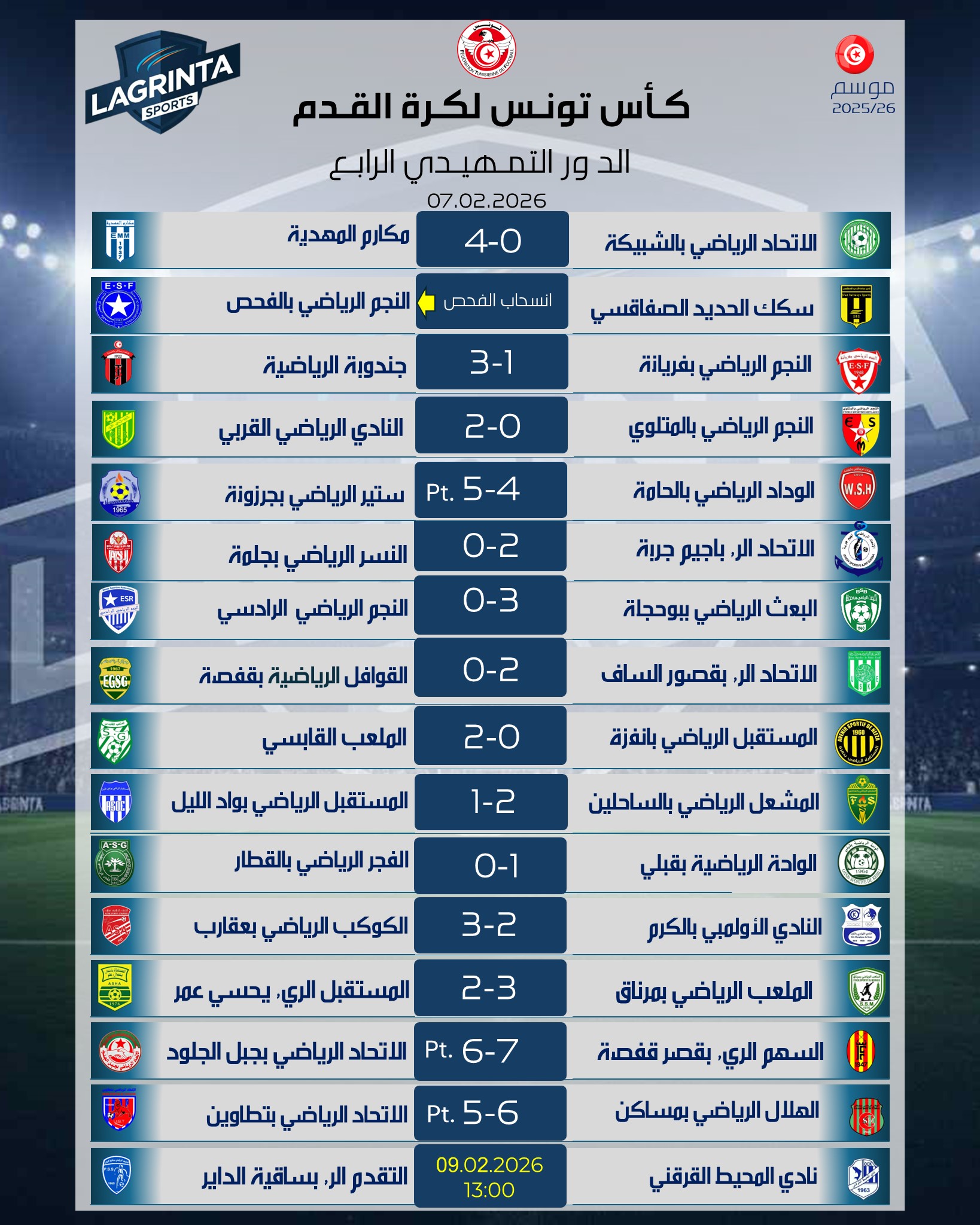 📅 السبت 07 فيفري 2026LAGRINTA SPORTS News a publié une note