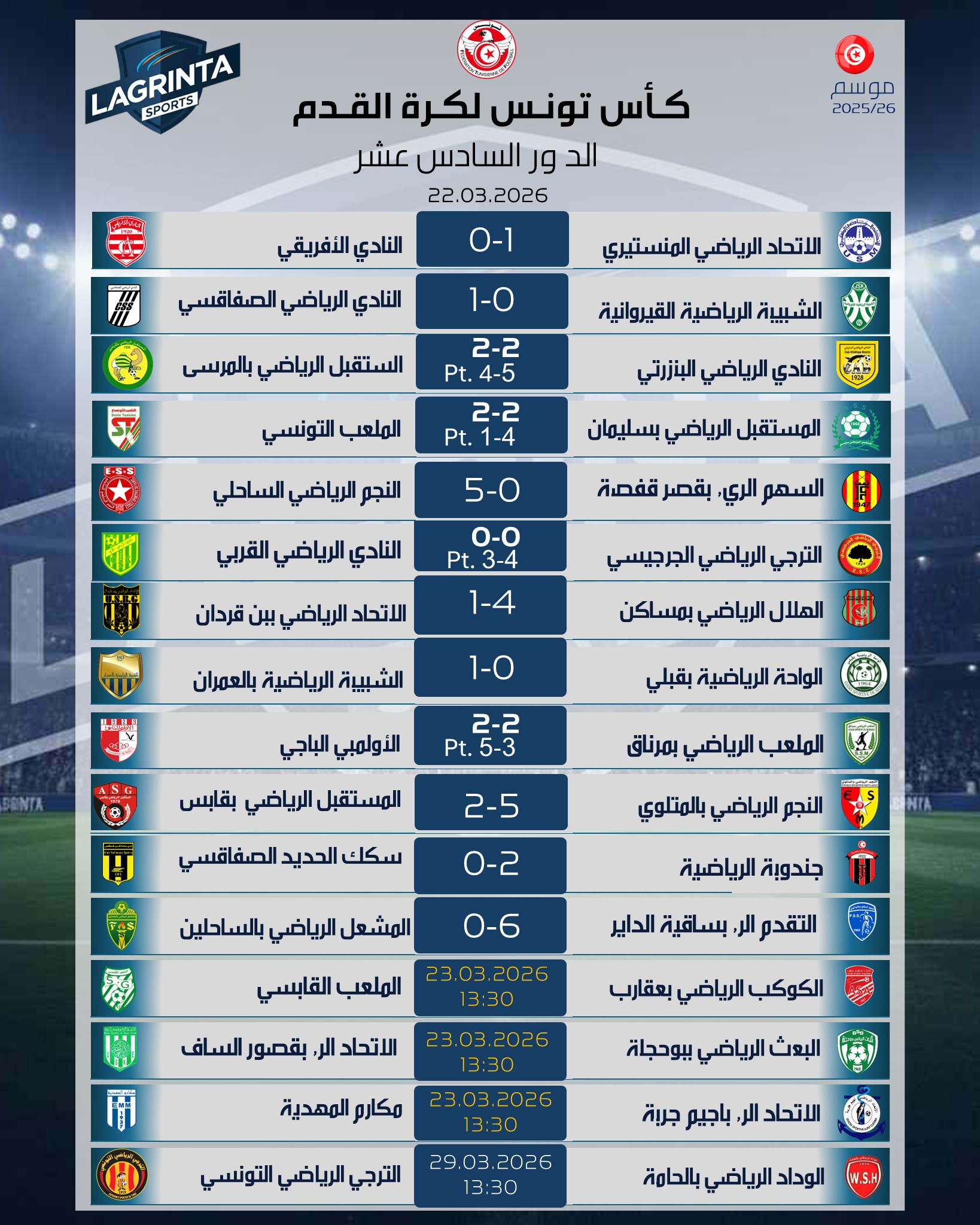 ⚽️ نتائج الدفعة الأولى. 22 مارس 2026LAGRINTA SPORTS News a publié une note