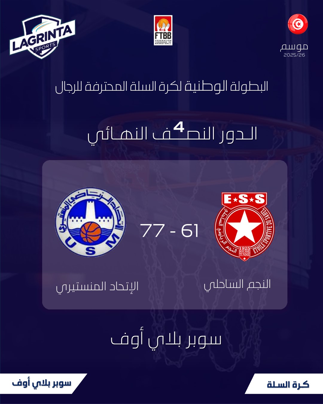 الاستعداد للمواجهة النهائية! 🏀البطولة الوطنية لكرة السلة للرجال 2025-2026 تشتعل مع قسم النخبة PRO.A ومرحلة SUPER PLAY OFF 🔥✅ شاهد نتيجةمباراة نصف النهائي 4 يومي 22 مارس 2026، وتحقق من الجدول الزمني الكامل 👇